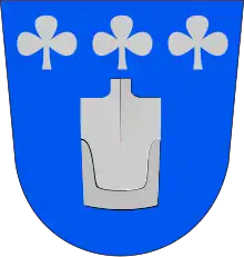 Azure, a shovel-head argent, three trefoils argent fesswise in chief.