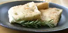 - (uncountable) A flatbread similar in style, composition, and texture to modern pizza doughs and topped with herbs, cheese and other products. Focaccia typically consists of high-gluten flour, oil, water, sugar, salt and yeast.