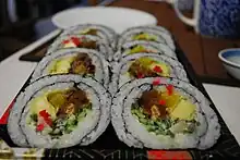 - Large cylindrical sushi, often vegetarian, with nori on the outside and fillings chosen to complement each other.