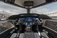 The glass cockpit of Learjet 75, featuring multiple large computer screens
