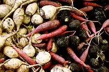 - (in the plural) root vegetables (the roots of plants used as foodstuff, such as carrots, parsnips, beets, etc.)