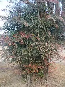 - An Asian ornamental shrub in the family Berberidaceae, with foliage and unbranched stems that look somewhat like one of the smaller bamboos, Nandina domestica.