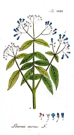 - (countable) A shrub, Lawsonia inermis, having fragrant reddish flowers