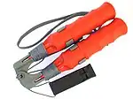 - ice claw, ice pick (awl-like tool for getting grip of ice when hauling oneself up from the water after having fallen through the ice; often designed to be carried as a pair around the neck for immediate availability)