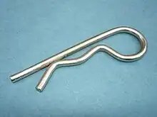 - R-clip, R-pin, R-key, hairpin cotter pin, hairpin cotter, bridge pin, hitch pin, spring cotter pin (type of fastener made of a springy rod and shaped like the letter "R", commonly used to secure the ends of round shafts)