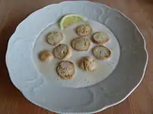 En portion koldskål med kammerjunkere og en skive citron.