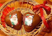 Two kiiltokuva depicting Santa Claus and used as a decoration for gingerbread