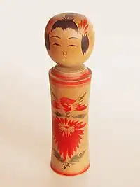 - A Japanese wooden doll with a spherical head having simple painted-on features, and a limbless, cylindrical body, typically featuring a painted-on floral design.