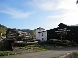 - sawmill (a building where one saws timber to produce wood for carpentry)
