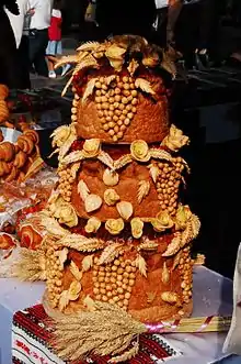 a large, single-piece round or rectangular loaf of bread, elaborately decorated and served at a wedding