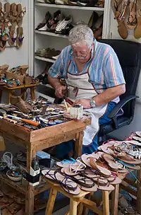 - (male) cobbler, shoemaker (craftsman who makes or repairs shoes, boots, sandals and other footwear)