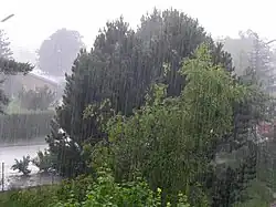 - rain, shower; rainwater
