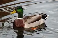 - Anas platyrhynchos, a common and widespread dabbling duck, natively found throughout the Northern Hemisphere, whose male has a distinctive dark green head.