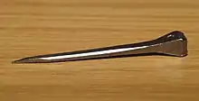 Borrowed from Amharic ምስማር (məsmar), from Arabic مِسْمَار (mismār), from Aramaic מַסְמָר (masmār).