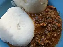 Tuwon shinkafa da miyar taushe. (Rice porridge with sorrel stew.)
