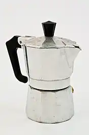 - A coffeemaker that produces coffee by passing boiling water pressurized by steam through ground coffee, traditionally made of aluminium.