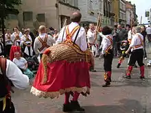 - A traditional English folk dance performed by a team of costumed dancers, often men but also men and women together or women only, who often wield sticks or handkerchiefs.