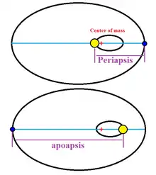 - (astronomy, astrophysics) The point of a body's (elliptical) orbit in a 2-body gravitational system such that the distance between the two bodies (measured from their respective centres of mass) is at its minimum.