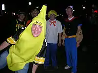 A man in a banana costume photobombing a group photo of some Halloween partygoers.