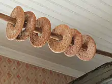 - A type of bread, usually of rye, that is flat and has a hole in the middle; originally the purpose of the hole was to facilitate storage in horizontal poles so as to keep the bread safe from rodents.