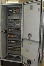 - electrical cabinet, electrical enclosure (cabinet for electrical or electronic equipment to protect the public from electrical shock and to protect the contents from the environment)