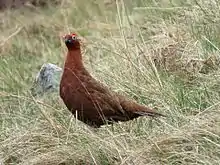 - red grouse (a medium-sized bird, Lagopus lagopus scotica, of the grouse family, found in heather moorland in Great Britain and Ireland)