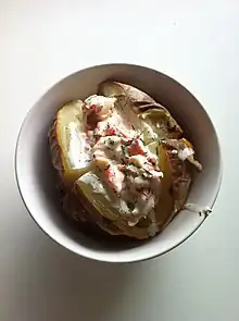 - A mixture of shrimp, mayonnaise, and dill; often including additional ingredients such as red onion and vendace roe.