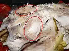 - oyster (delicate morsel of dark meat contained in a small cavity of the bone on each side of the lower part of the back of a fowl)