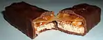 - chocolate bar (longish, slender chocolate bar which may be solid or with filling, one slab or divided into detachable bits)
