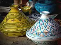 - (cooking) An earthenware cooking pot of North African origin, consisting of a shallow, round dish without handles and a tall, conical or dome-shaped lid.