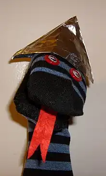 - A piece of headgear made from one or more sheets of tin foil, aluminium foil, or other similar material, worn in the belief that it shields the brain from such influences as electromagnetic fields or mind control.