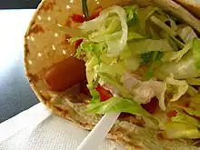 1. a thin bread roll, a fast food dish consisting of a hot dog (or other meat), mashed potatoes, and salad, rolled in a wrap of soft flatbread (tunnbröd)