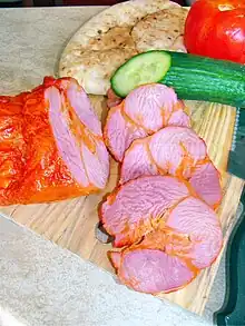 A processed food made primarily from cooked or cured