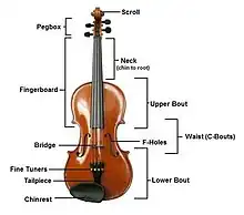 Sino-Vietnamese word from 尾琴, composed of 尾 (“tail”) and 琴 (“string instrument”), referring to the fact that the ribbon of the bow is made from a horse tail.
