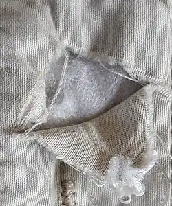 - a rectangular tear or cut in a piece of clothing or other fabric, in the form of a try square.